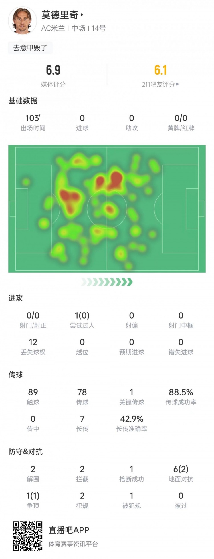 11月30日讯 意甲第13轮比赛,莫德里奇踢满全场,米兰主场1-0击败拉齐奥。莫德里奇本场比赛数据:出场时间——103分钟尝试过人——1(成功0)丢失球权——12触球——89传球——78关键传球——1传球成功率——88.5%长传——7(准确率42.9%)解围——2拦截——2抢断成功——1地面对抗——6(成功2)争顶——1(成功1)犯规——2被犯规——1媒体评分——6.9