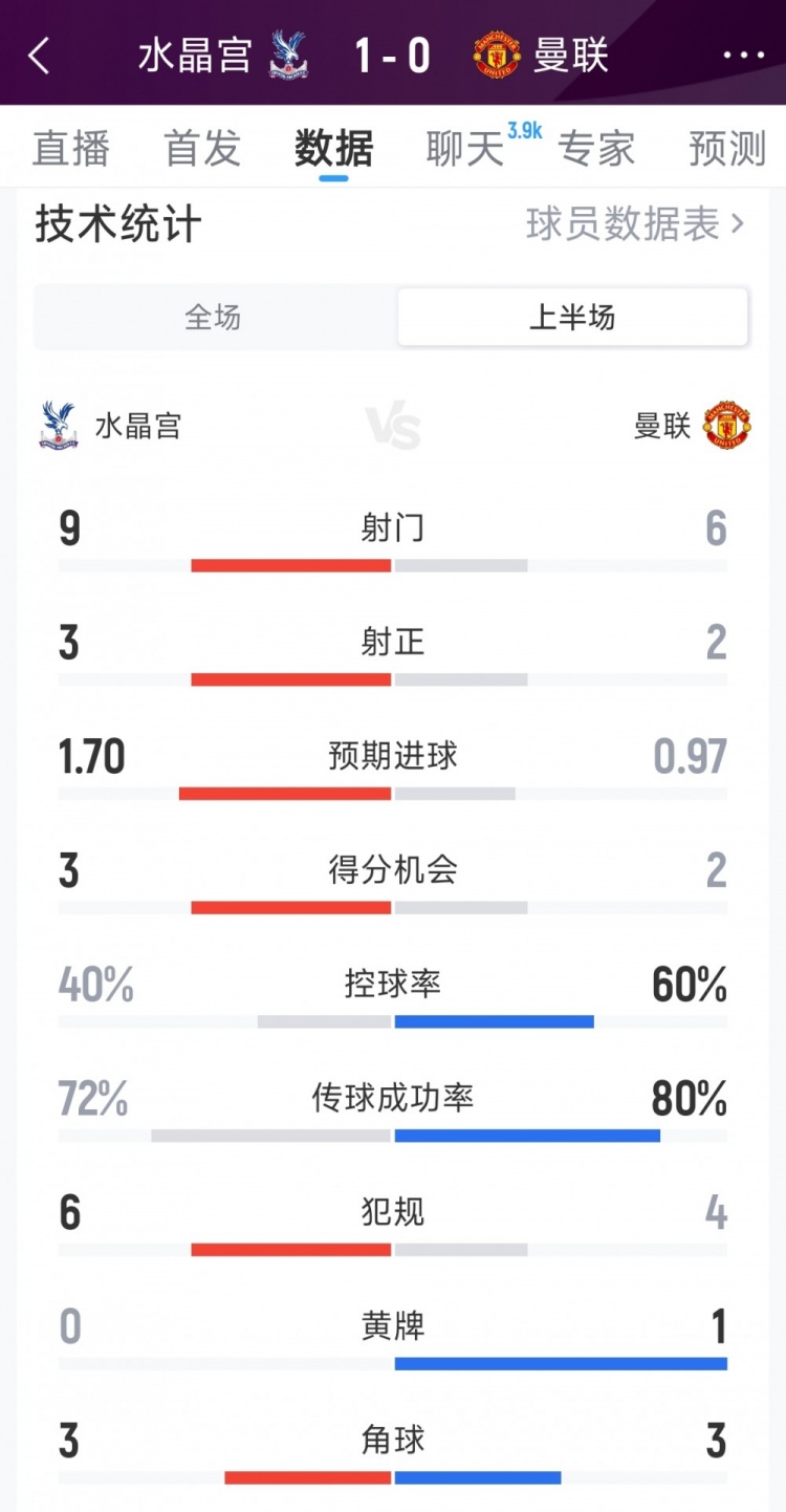11月30日讯 本轮英超曼联对阵水晶宫半场战罢,水晶宫凭借马特塔点球暂时1-0领先,以下为双方半场数据对比:水晶宫vs曼联射门:9-6射正:3-2预期进球:1.70-0.97得分机会:3-2控球率:39%-61%传球成功率:72%-80%犯规:6-4黄牌:0-1角球:3-3