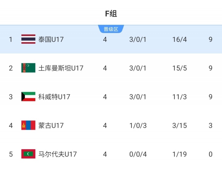 11月30日讯 U17亚洲杯预选赛F组,泰国U16末轮3-0击败科威特U16绝地逃生,晋级U17亚洲杯正赛。预选赛结束,泰国U16、土库曼斯坦U16和科威特U16同积9分,泰国U16最终凭借净胜球的优势晋级。