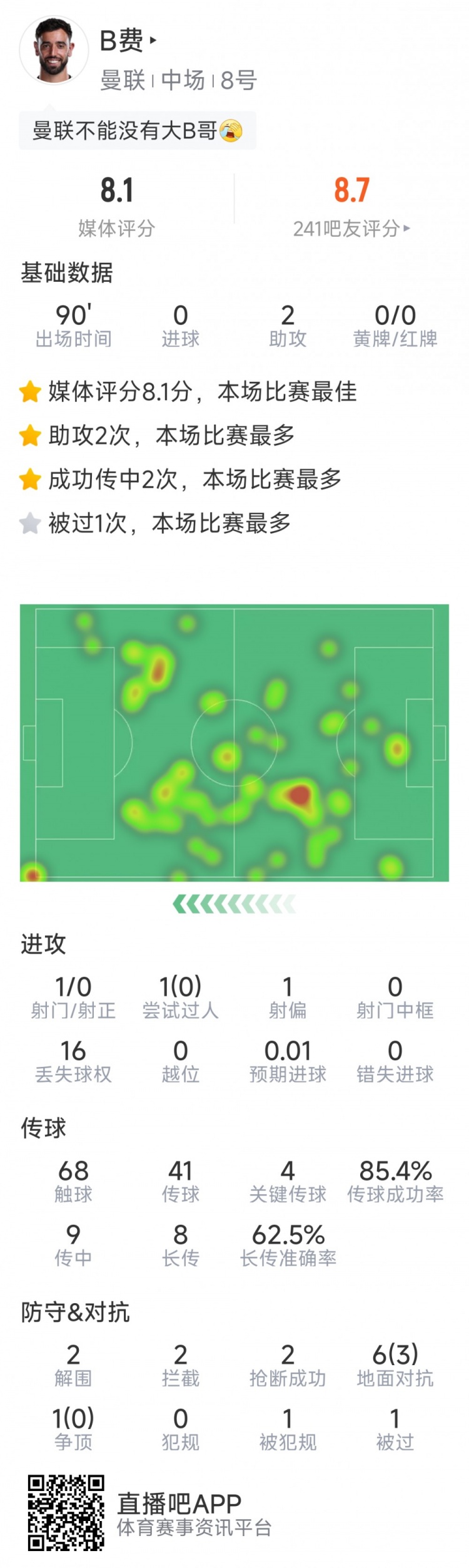 11月30日讯 在本轮英超,曼联2-1击败水晶宫,B费助攻双响,以下为他在本场数据:比赛时间90分钟2次助攻1次射门0射正68次触球4次关键传球传球成功率85.4%2次解围2次拦截2次抢断7次对抗3次成功评分8.1分
