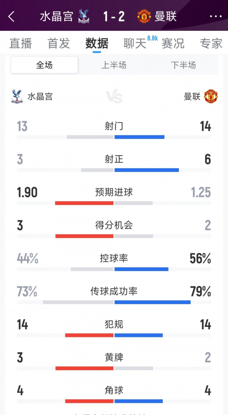 11月30日讯 在本轮英超,曼联2-1逆转战胜水晶宫,以下为双方全场数据对比:水晶宫vs曼联射门:13-14射正:3-6预期进球:1.90-1.25得分机会:3-2控球率:44%-56%传球成功率:73%-79%犯规:14-14黄牌:3-2角球:4-4