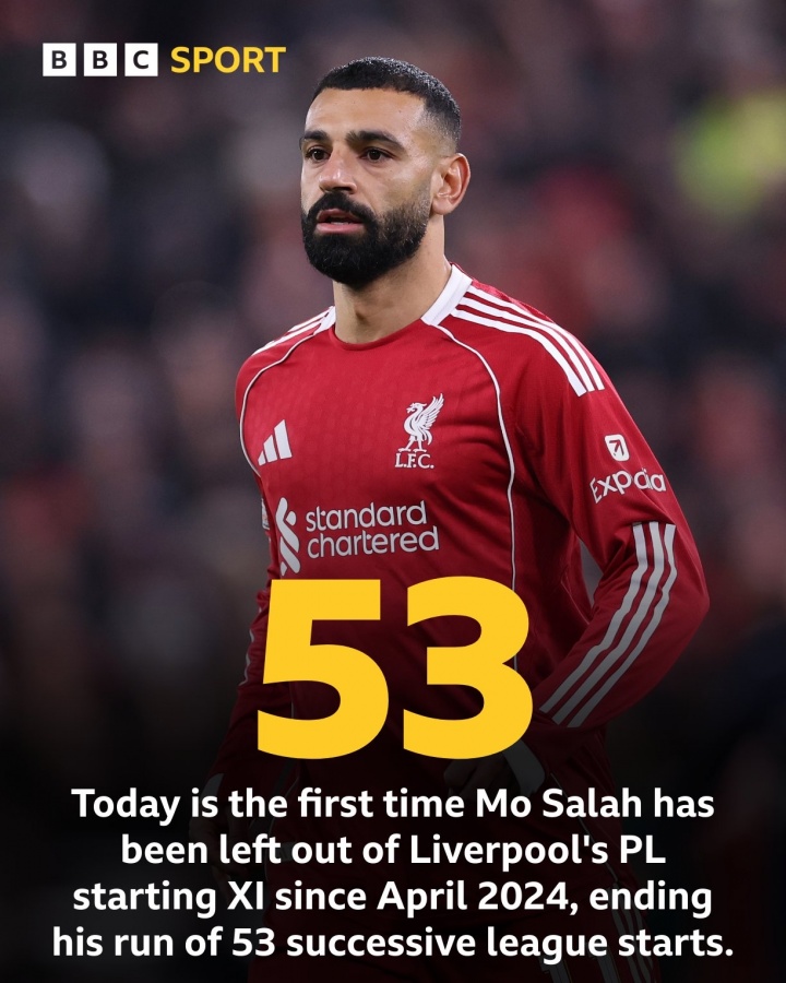 萨拉赫上一次在英超比赛中替补,还是2024年4月27日利物浦2-2战平西汉姆联,那是利物浦还是克洛普执教,萨拉赫下半场比赛替补登场。此后53场英超联赛,萨拉赫全部首发。