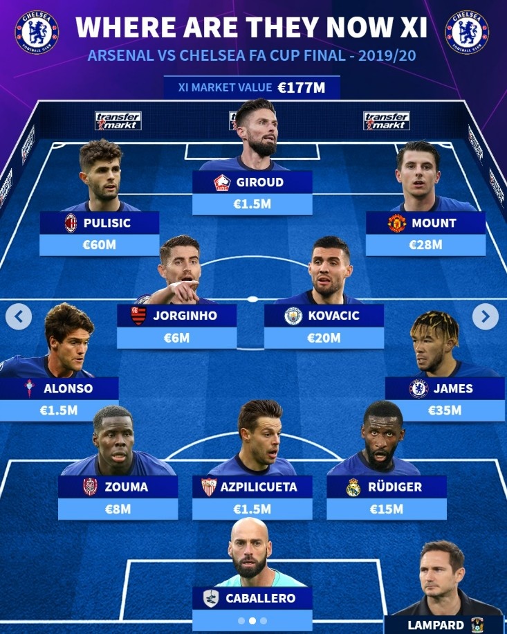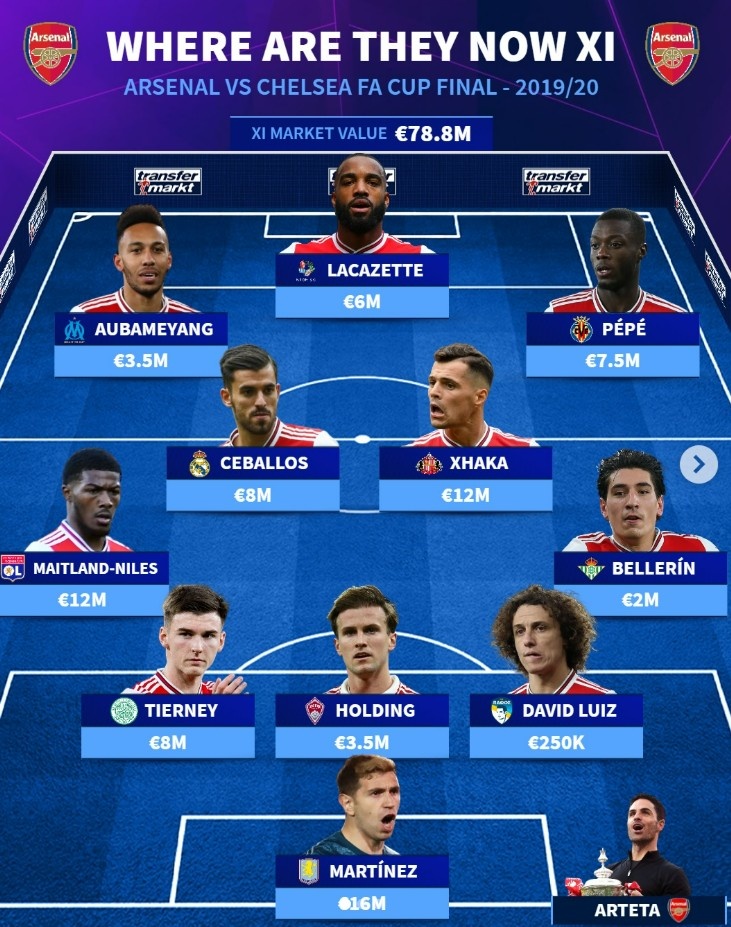 11月30日讯 本轮英超焦点战阿森纳对阵切尔西即将打响,德转盘点了两支球队在19/20赛季足总杯决赛(阿森纳2-1取胜夺冠)对阵时首发人员去向,两队仅剩里斯-詹姆斯仍在队中,具体如下: