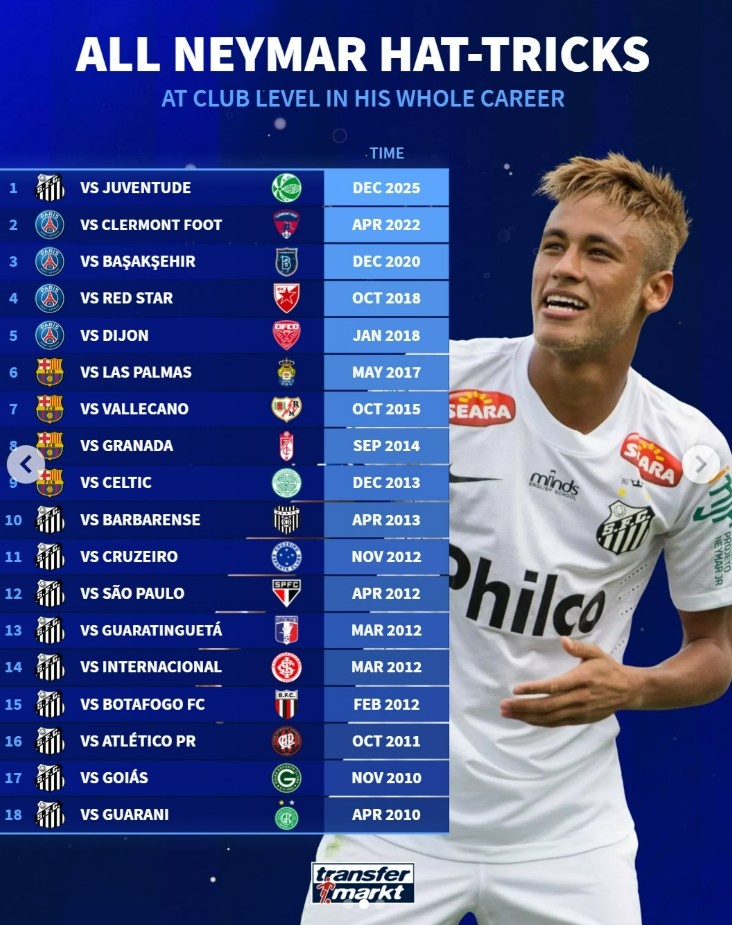 12月4日讯 在本轮巴甲,桑托斯3-0击败尤文图德,内马尔上演帽子戏法。据统计,这是内马尔俱乐部生涯第18次上演帽子戏法,其中前9次都是其生涯早期效力桑托斯时做到,在巴萨效力时期对阵凯尔特人、格拉纳达、巴列卡诺以及拉斯帕尔马斯曾上演帽子戏法,转会巴黎后也曾在对阵第戎、贝尔格莱德红星等4场比赛打进3球。