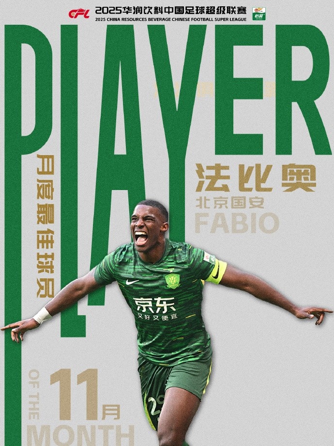 12月8日讯 2场比赛攻入6球的国安外援法比奥,当选为中超11月最佳球员。11月的2场联赛,北京国安外援法比奥轰入6球送出1次助攻,并在末轮上演大四喜,成为本赛季的中超金靴。注:11月评选范围为第29-30轮,共计2轮,参选球员数据以上述2轮比赛数据为准。