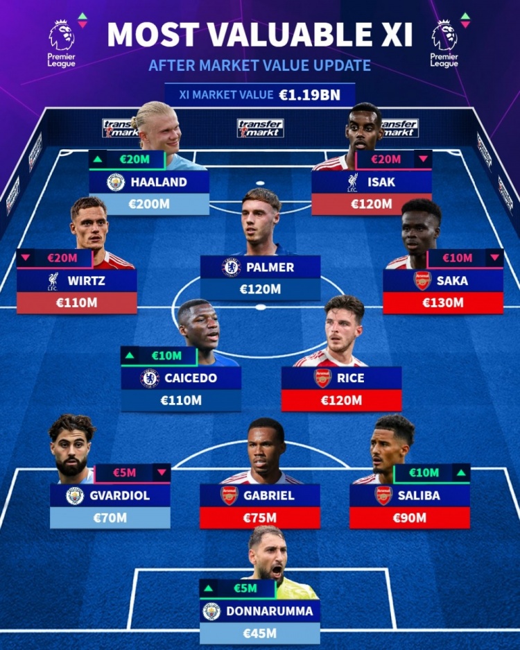 12月9日讯 德国转会市场盘点了英超最贵阵容,哈兰德2亿欧元居首。英超最贵阵容:门将:多纳鲁马(曼城,4500万欧元)后卫:格瓦迪奥尔(曼城,7000万欧元)、加布里埃尔(阿森纳,7500万欧元)、萨利巴(阿森纳,9000万欧元)中场:凯塞多(切尔西,1.1亿欧元)、赖斯(阿森纳,1.2亿欧元)、帕尔默(切尔西,1.2亿欧元)前锋:维尔茨(利物浦,1.1亿欧元)、哈兰德(曼城,2亿欧元)、伊萨克(利物浦,1.2亿欧元)、萨卡(阿森纳,1.3亿欧元)