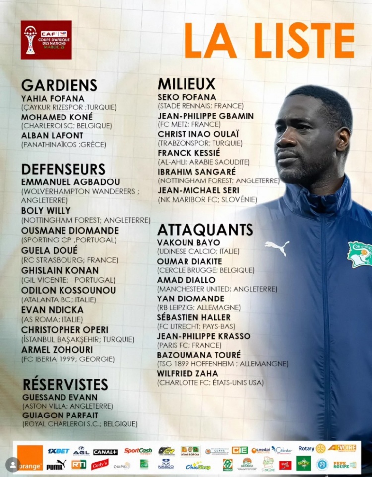 前锋:瓦科安·巴约(乌迪内斯)、奥马尔·迪亚基特(色拉格布鲁日)、阿玛德·迪亚洛(曼联)、扬·迪奥曼德(RB莱比锡)、阿莱(乌德勒支)、菲利普·克拉索(巴黎FC)、巴祖马纳·图雷(霍芬海姆)、扎哈(夏洛特FC)