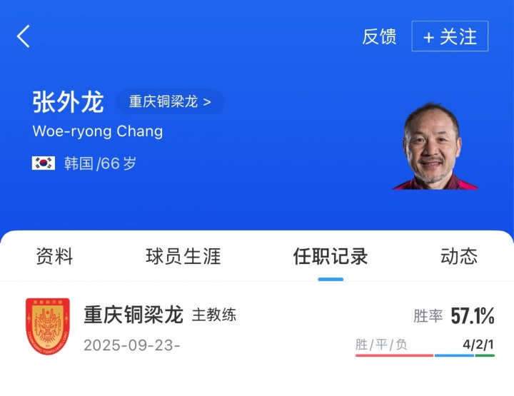 张外龙现年66岁,韩国籍主帅,在今年9月23日接手重庆铜梁龙,带队7场4胜2平1负,帮助球队以中甲第二收官成功冲超。