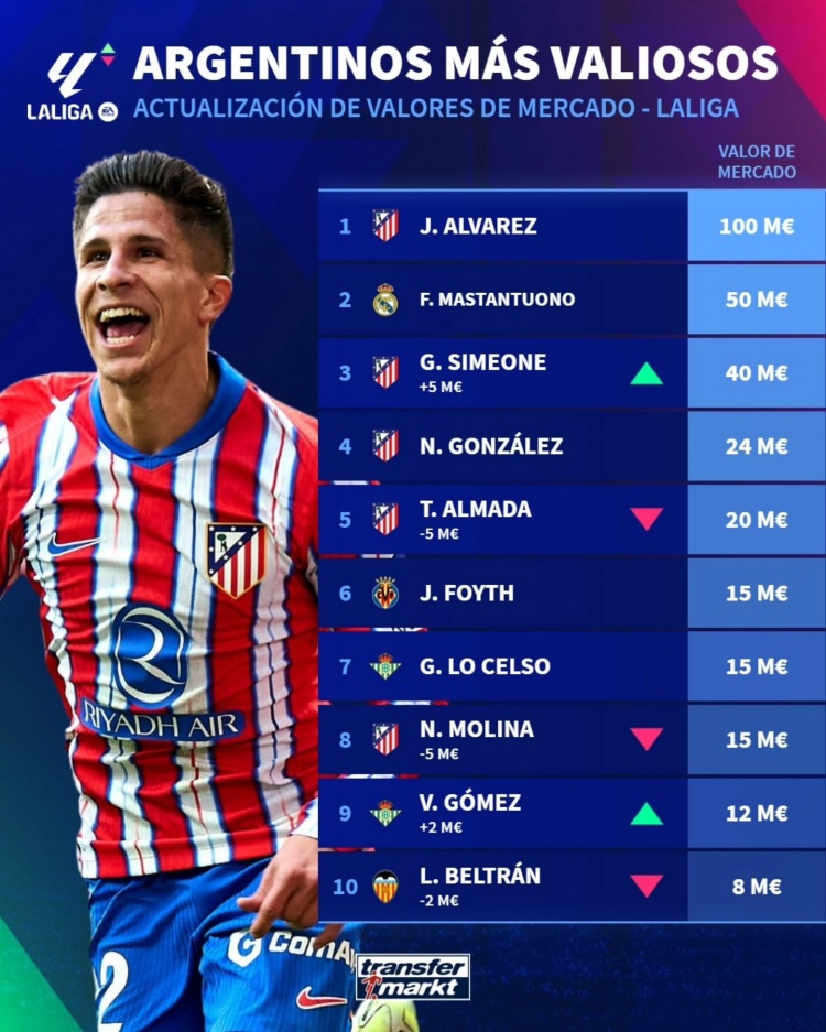 12月13日讯 德国转会市场更新了西甲球员的身价,并列出西甲阿根廷球员身价排名,阿尔瓦雷斯1亿欧居首,马斯坦托诺5000万欧次席。