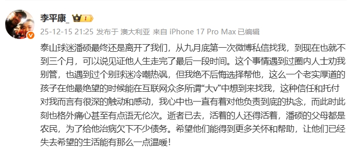 李平康写道:泰山球迷潘硕最终还是离开了我们,从九月底第一次微博私信找我,到现在也就不到三个月,可以说见证他人生走完了最后一段时间。这个事情遇到过圈内人士劝我别管,也遇到过个别球迷冷嘲热讽,但我绝不后悔选择帮他,这么一个老实厚道的孩子在他最绝望的时候能在互联网众多所谓“大v”中想到来找我,这种信任和托付对我而言有很深的触动和感动,我心中也一直有着对他负责到底的执念,而此时此刻也格外痛心甚至有点语无伦次。