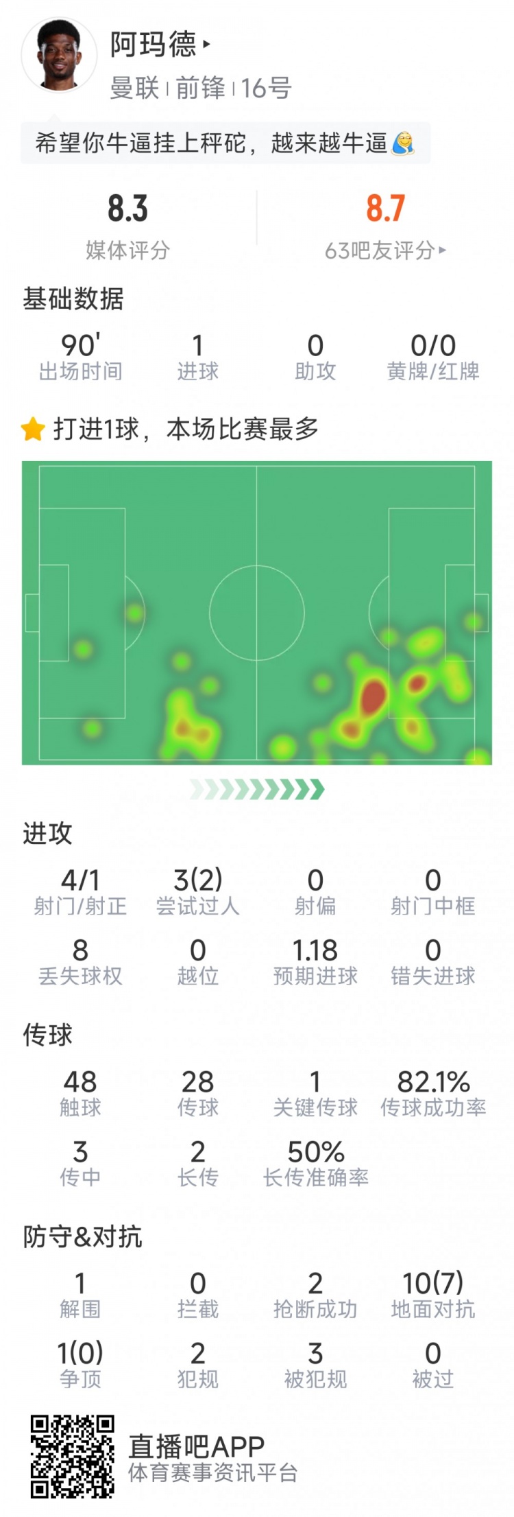 12月16日讯 在本轮英超,曼联4-4战平伯恩茅斯,以下为阿玛德本场数据:比赛时间90分钟1粒进球4射1正3次过人2次成功48次触球1次关键传球传球成功率82%1次解围2次抢断11次对抗7次成功评分8.3分
