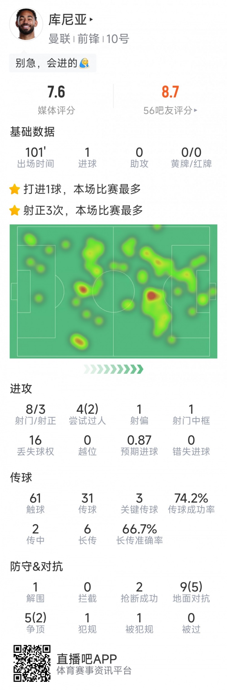 库尼亚本场数据:1粒进球,8射3正,1次中框,3次关键传球