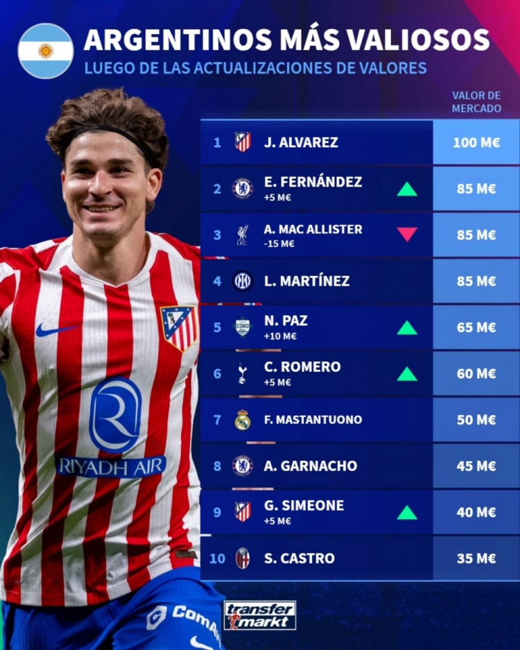 12月27日讯 德国转会市场更新了各大联赛球员的身价,并列出阿根廷球员身价排名,阿尔瓦雷斯1亿欧居首。