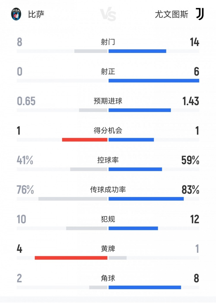 尤文2-0比萨数据:射门14-8,射正6-0,得分机会1-1,角球8-2