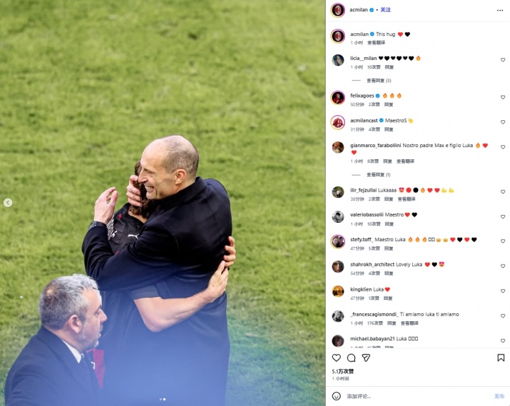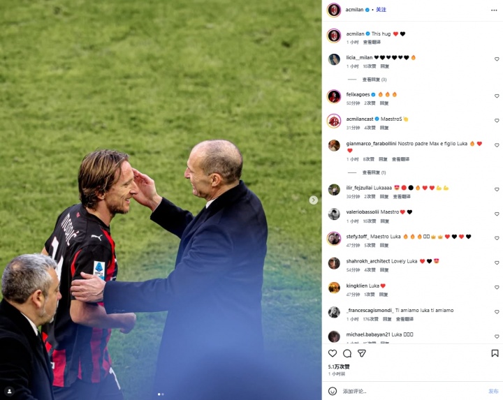 第70分钟莫德里奇被换下,随后莫德里奇得到全场球迷的掌声。比赛结束后米兰官方晒出图,阿莱格里与莫德里奇拥抱。