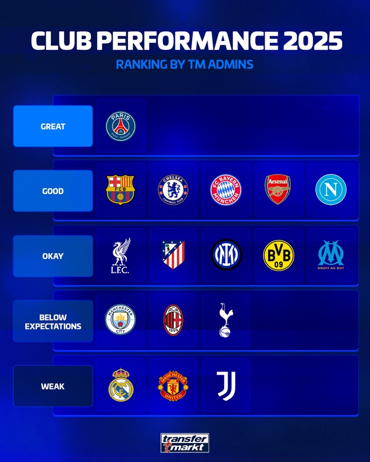 12月28日讯 2025年即将结束,德转发布了一张他们对各家欧洲豪门今年表现的评级,巴黎唯一“顶级”,皇马、曼联尤文“拉完了”。德转评级各豪门2025表现↓夯(棒极了):巴黎顶级(挺好的):巴萨、切尔西、拜仁、阿森纳、那不勒斯人上人(还可以):利物浦、马竞、国米、多特、马赛NPC(低于预期):曼城、AC米兰、热刺拉完了(差劲):皇马、曼联、尤文