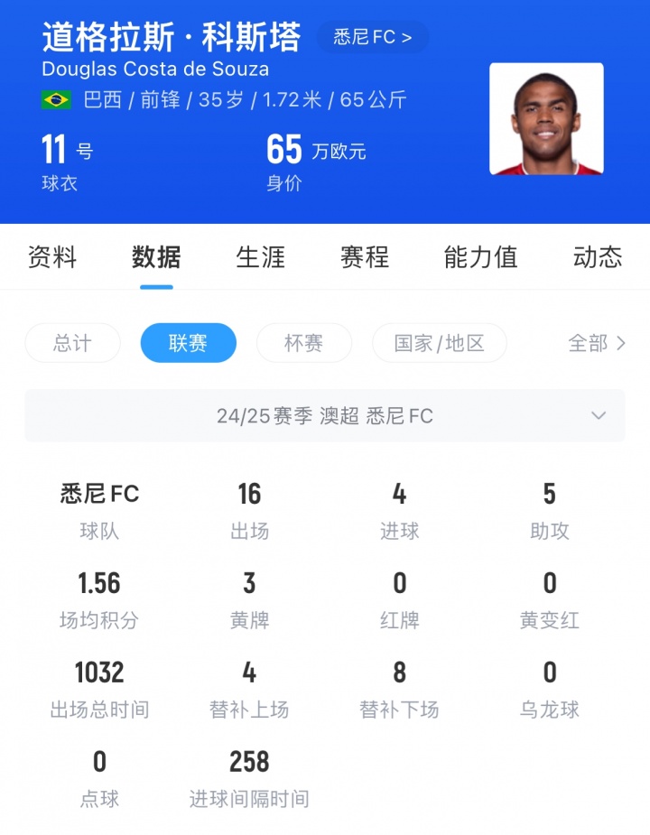 道格拉斯·科斯塔曾效力拜仁、尤文等俱乐部,上赛季为悉尼FC出战25场比赛,打进6球,助攻8次。