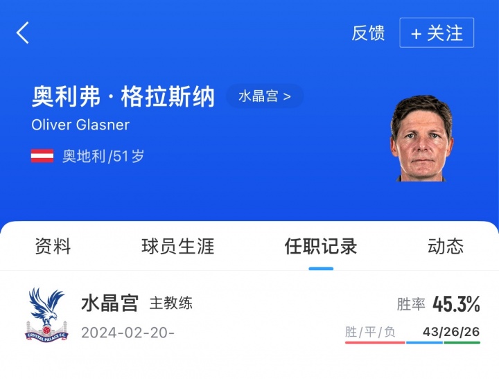 格拉斯纳于2024年2月出任水晶宫主帅,带队至今帮助水晶宫夺得足总杯以及社区盾冠军。