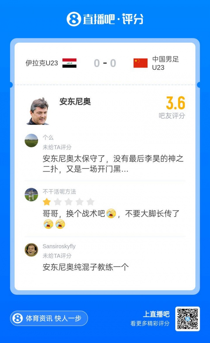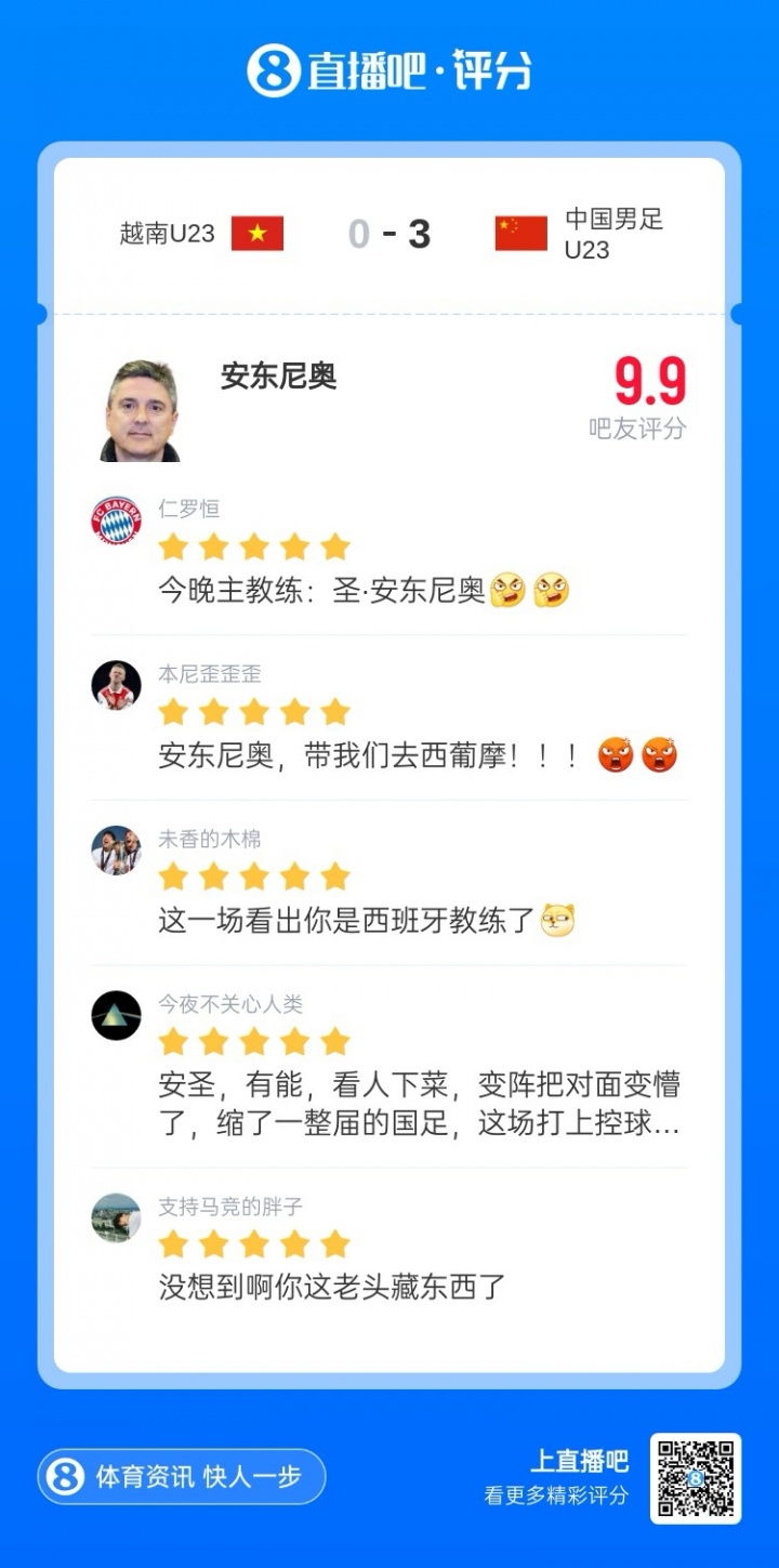 01月21日讯 U23亚洲杯半决赛,U23国足3-0战胜U23越南,决赛对阵U23日本。U23亚洲杯首场比赛,U23国足战平伊拉克后,吧友为安东尼奥打出3.6分的低分,而如今球队打入决赛,本场比赛,安东尼奥获9.9分高分。