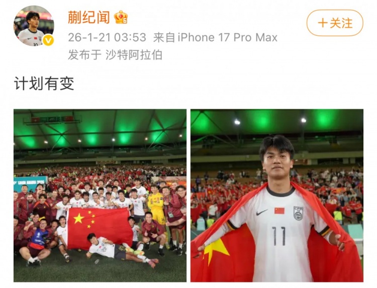 1月21日讯 U23亚洲杯半决赛,U23国足3-0完胜越南U23,队史首次进军赛事决赛将战日本。赛后为U23国足首发出战的蒯纪闻更新社媒,晒出赛后全队合影以及自己身披国旗的照片,并配文写道:“计划有变”。按照赛程,U23亚洲杯决赛,中国vs日本的比赛将在北京时间1月24日晚23:00打响。