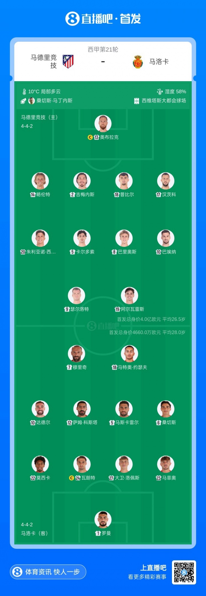 01月25日讯 北京时间今晚21点,西甲第21轮,马竞主场迎战马洛卡。赛前,双方首发出炉。