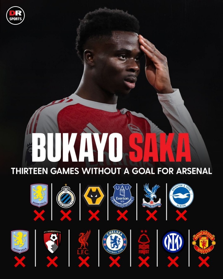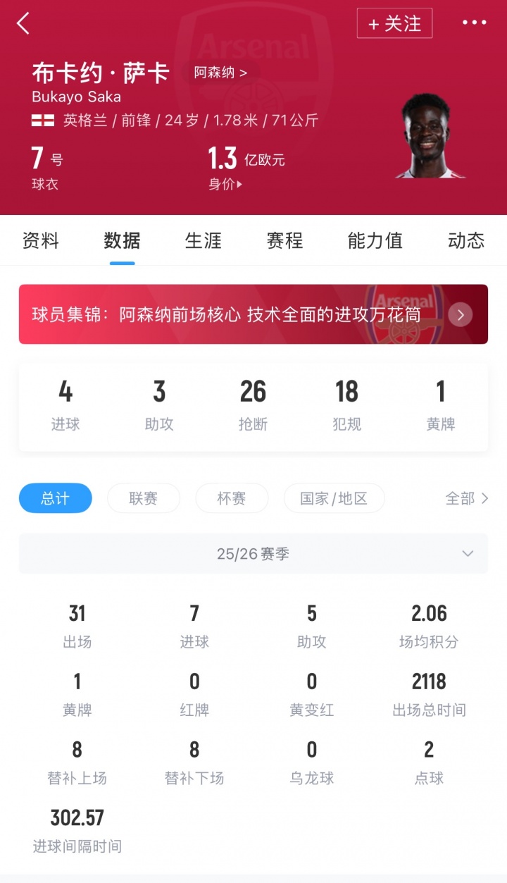 01月26日讯 本轮英超阿森纳主场2-3不敌曼联,本场比赛萨卡首发打满全场,没有贡献进球与助攻。值得一提的是,萨卡已经连续13场比赛上场后没能收获进球,他本赛季各赛事出场31场比赛,总计贡献7球5助。在上个月德转身价更新后,萨卡从之前的1.4亿欧元下降至现在的1.3亿欧元。而据此前罗马诺、奥恩斯坦等名记报道,萨卡已经与阿森纳敲定续约,目前还未官宣。据英媒《泰晤士报》此前消息,萨卡在续约后将拿到队内顶薪,周薪约为30万英镑。