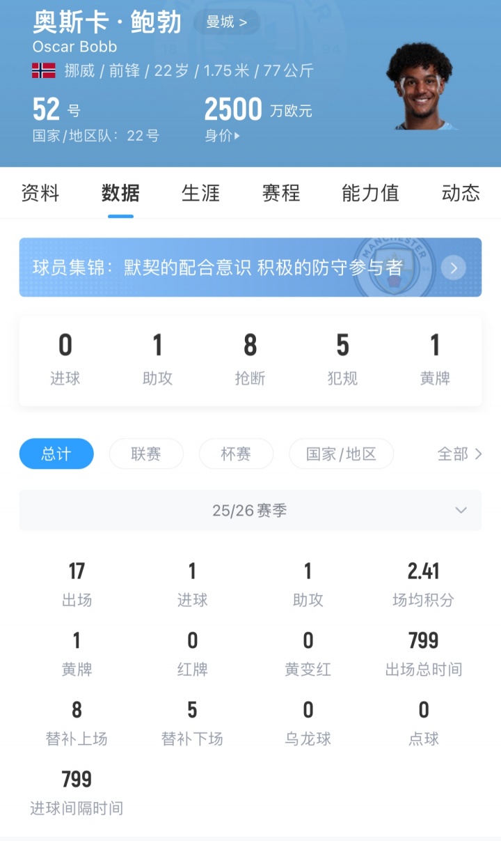 鲍勃现年22岁,司职右边锋,也能出任左边锋、进攻型中场位置,目前球员德转估值2500万欧,与曼城合同在2029年到期。新赛季至今,他代表曼城各赛事出战15场有1次助攻。