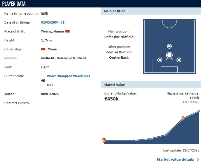 01月29日讯 德转更新徐彬信息,他已经成为狼队U21球员。此前独家获悉,U23国足队长徐彬将会加盟英超球队狼队,不过预计球员将会被外租。去年11月独家披露过,徐彬当时已和英超狼队接触近半年,留洋下家为狼队。徐彬现年21岁,司职后腰,出身于广州恒大足校,他是恒大足校出品的首位男足国脚,2022年在广州队完成中超首秀,2025年1月徐彬自由身加盟青岛西海岸。2025赛季代表青岛西海岸出战30场比赛,其中在中超出战27场,贡献3次助攻。