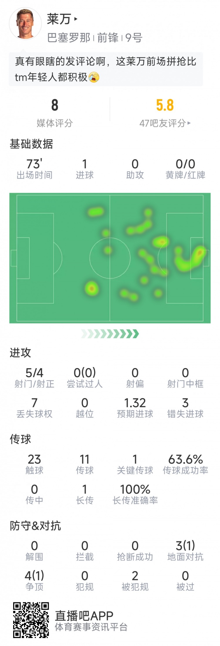 莱万本场数据:1粒进球,5射4正,3次错失良机,1次关键传球