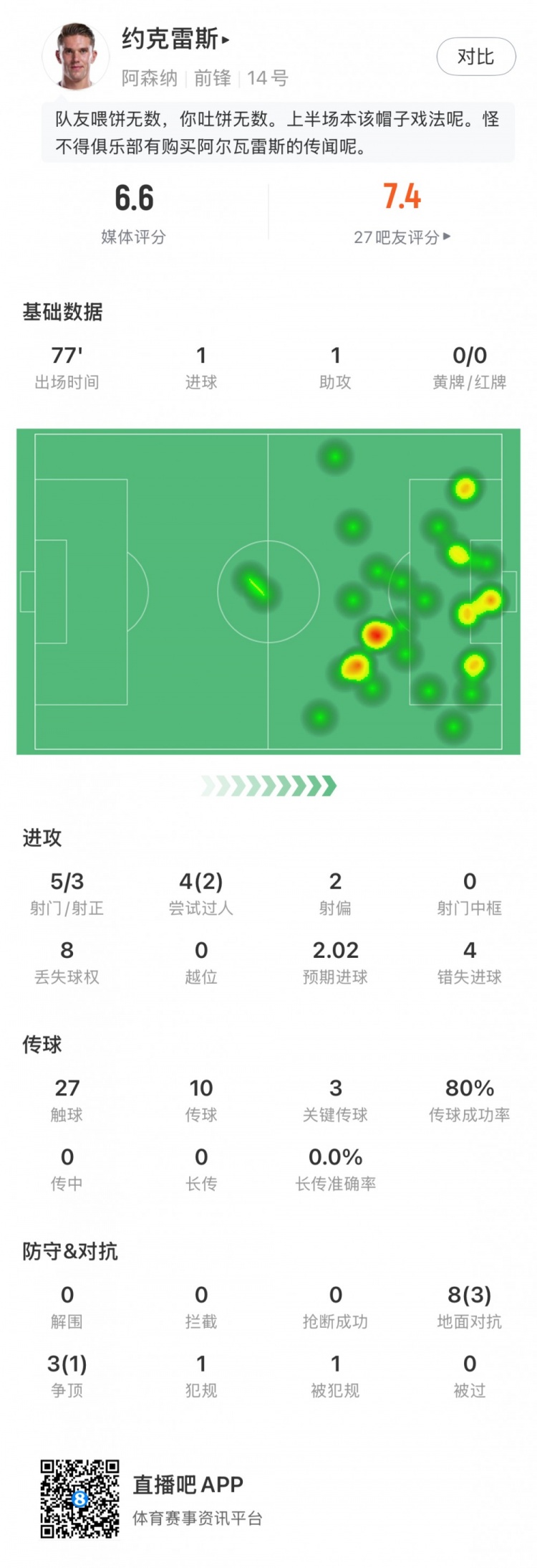 1月29日讯 欧冠联赛阶段第8轮,阿森纳主场对阵阿拉木图凯拉特,约克雷斯代表阿森纳首发出战,在第77分钟被替换下场,球员本场数据如下:1进球1助攻射门5射3正过人4次成功2次丢失球权8次预期进球2.02错失进球4触球27,传球10,关键传球3,传球成功率80%地面对抗8次,成功3次争顶3次,成功1次犯规1,被犯规1