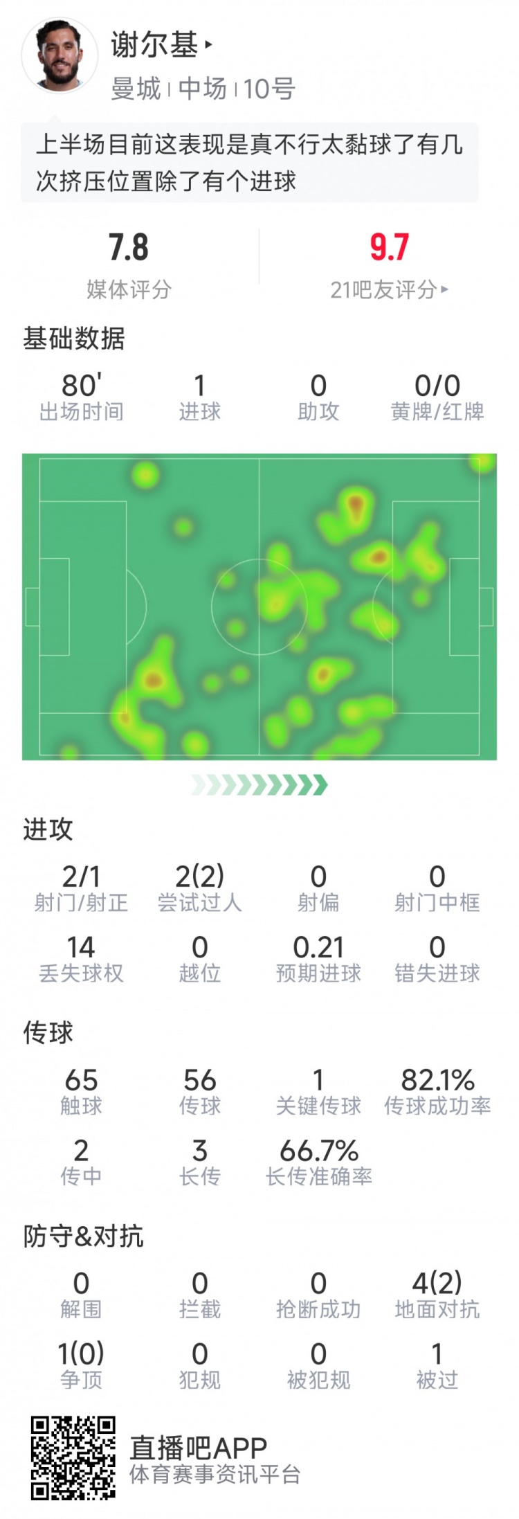 1月29日讯 在本轮欧冠曼城对阵加拉塔萨雷的比赛中,谢尔基打进一球,以下为他在本场数据: