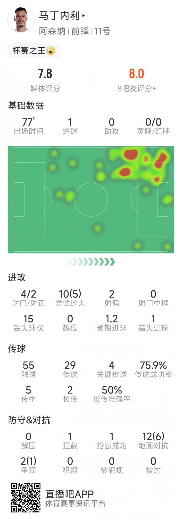 1月29日讯 在本轮欧冠阿森纳对阵阿拉木图凯拉特,马丁内利破门,以下为他在本场数据:比赛时间77分钟1粒进球4射2正10次过人5次成功1次错失良机55次触球吧4次关键传球传球成功率76%1次拦截1次抢断14次对抗7次成功评分7.8分