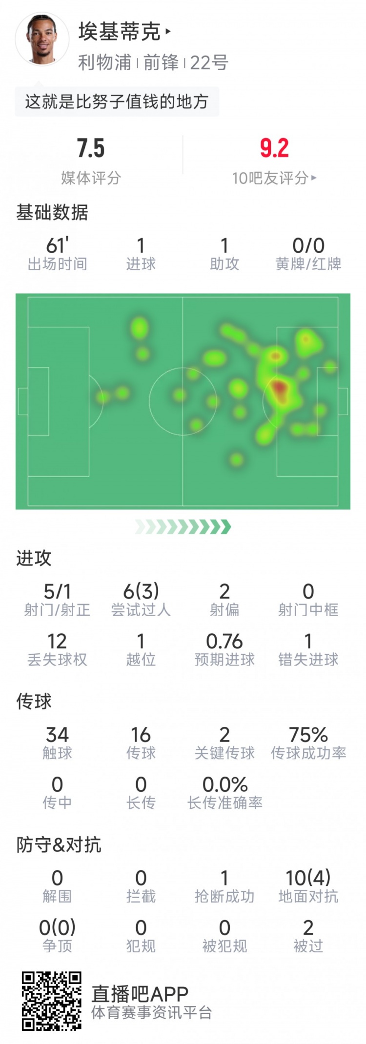 1月29日讯 在本轮欧冠利物浦对阵卡拉巴赫,埃基蒂克传射建功,以下为他在本场数据:比赛时间61分钟1球1助攻5射1正6次过人3次成功1次错失良机38次触球2次关键传球传球成功率70%1次抢断10次对抗4次成功评分7.5分