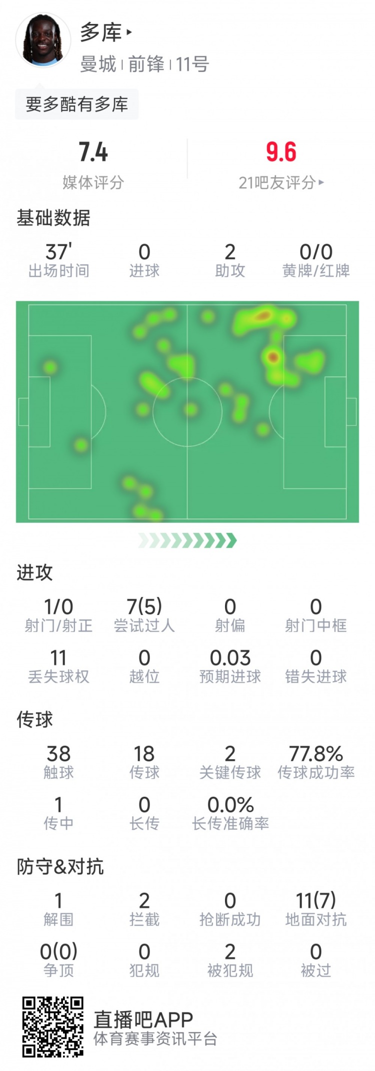 1月29日讯 在本轮欧冠曼城对阵加拉塔萨雷,多库助攻双响,以下为他在本场数据:比赛时间37分钟2次助攻1次射门0射正7次过人5次成功38次触球2次关键传球传球成功率78%1次解围2次拦截11次对抗7次成功评分7.4分