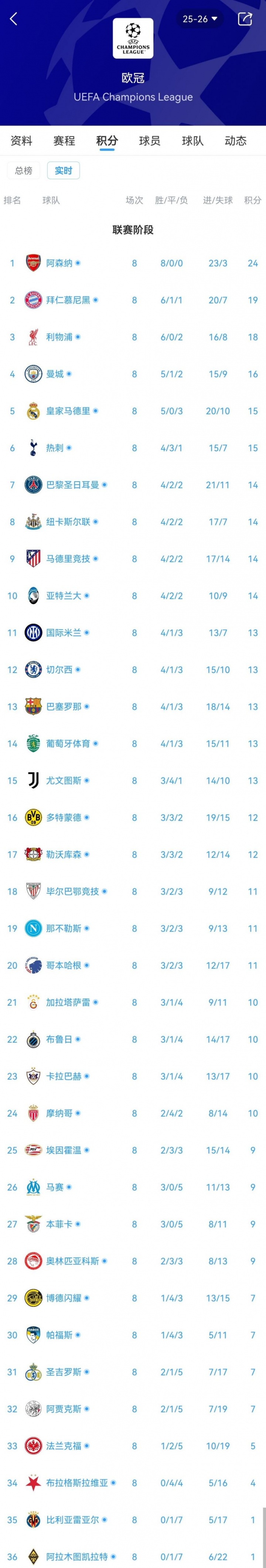 半场实时积分榜:曼城暂时进入前8 切尔西跌出前8巴萨落后
