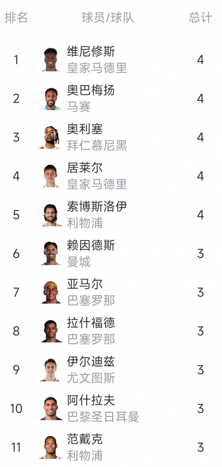 1月29日讯 欧冠联赛阶段战罢,以下为目前本赛季欧冠助攻榜情况:1、维尼修斯、奥巴梅扬、奥利塞、居莱尔、索博斯洛伊 4次6、赖因德斯、亚马尔、拉什福德、伊尔迪兹、阿什拉夫、范戴克、费尔明、克瓦拉茨赫利亚、多库、格纳布里、莱默尔 3次