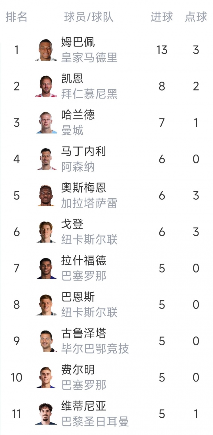 1月29日讯 欧冠联赛阶段战罢,以下为本赛季目前欧冠射手榜情况: