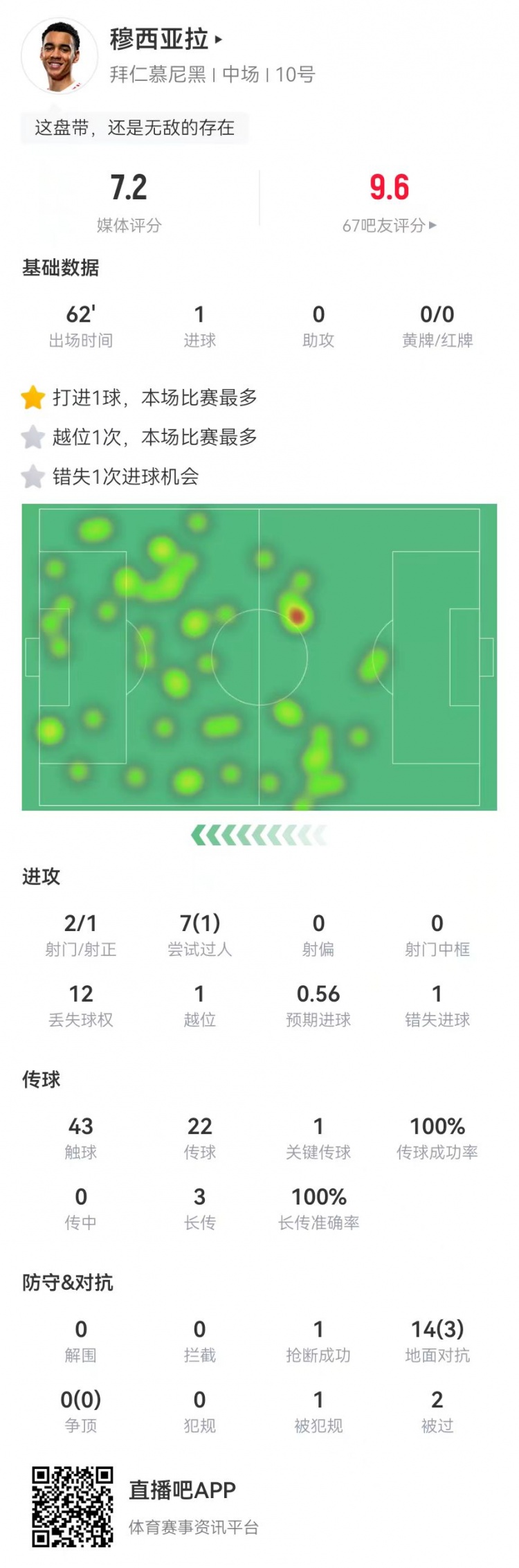 1月29日讯 拜仁在本轮欧冠2-1力克埃因霍温,穆西亚拉本场数据如下:首发出战62分钟1球2射1正7过人、1成功12丢失球权预期进球0.561越位1错失进球43触球22传球,成功率100%1关键传球3长传、3成功1抢断14对抗、3成功1造犯规2被过获评7.2分