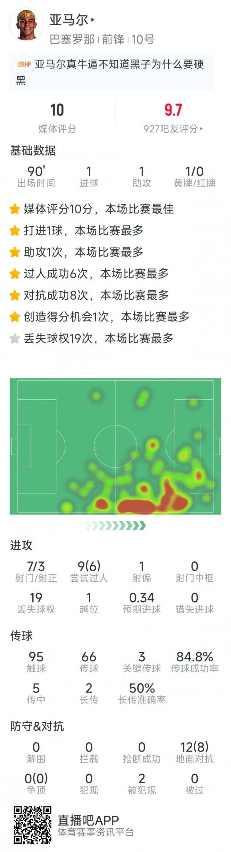 1月29日讯 在本轮欧冠,巴萨4-1击败哥本哈根,以下为亚马尔本场数据: