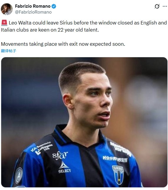 1月29日讯 据记者罗马诺消息,英超和意甲球队关注芬兰中场莱奥·沃尔塔。罗马诺在个人社媒写道:“莱奥·沃尔塔很可能在冬窗关闭前离开瑞典超天狼星俱乐部,因为英超和意甲球队对这位22岁天才很感兴趣,预计转会很快发生。”莱奥·沃尔塔现年22岁,芬兰国脚中场,2024年加盟天狼星俱乐部,共为该队出战63次,贡献24球6助攻,德转身价为350万欧。