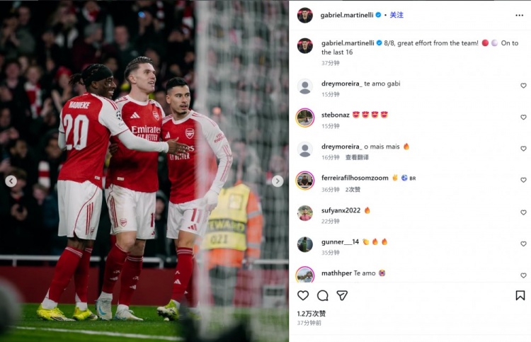 1月29日讯 阿森纳在本轮欧冠3-2力克阿拉木图凯拉特,马丁内利取得进球。第38分钟,阿森纳前场打出一次精彩短传配合,诺尔高背身送出直塞,哈弗茨禁区右侧低平球横传,后点约克雷斯将球碰了一下,马丁内利包抄近距离推射破门,VAR介入,主裁判确认进球有效。马丁内利也在赛后通过社媒晒出自己的庆祝照,并配文:“8战8胜,全队表现出色!