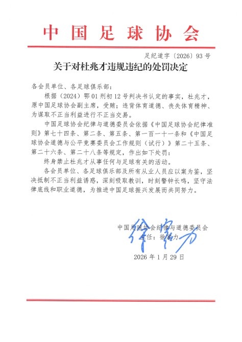 1月29日讯 天足协公布了第二批“赌球假球专案涉案足球从业人员”名单,终身禁止从事任何与足球有关活动的73人当中包括原中国足协副主席杜兆才。