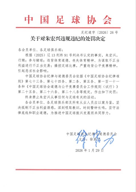 1月29日讯 今日,中国足协正式公布了“假赌黑”专项整治行动受处罚的人员名单,朱宏兴因行贿、参与赌球、操控比赛等,被判终身禁止参与足球活动。