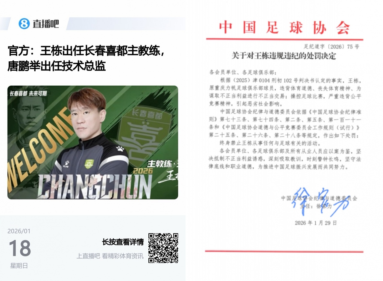 11天前官宣出任长春喜都主帅,前国脚王栋今天被足协官宣终身禁足