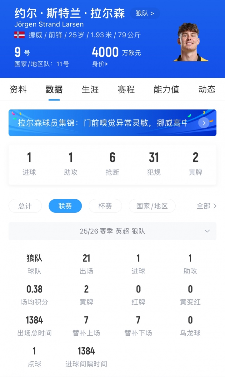 01月29日讯 罗马诺以标志性的“here we go”宣布,水晶宫签下狼队前锋拉尔森,转会费总价5000万镑。本赛季,他本赛季为球队出场25次,贡献6球2助,其中英超21场仅1球1助。目前狼队英超垫底,落后处于降级区外的森林17分。拉尔森现年25岁,去年夏窗以3000万欧永久转会狼队,他与狼队的合同至2030年,现身价4000万欧。