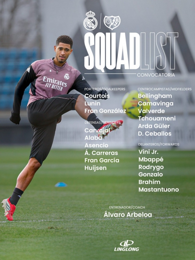 1月31日讯 北京时间2月1日21:00,2025-26赛季西甲联赛第22轮,皇马将坐镇伯纳乌球场迎战巴列卡诺。今日,皇马公布本场比赛球队大名单,尽管吕迪格和阿诺德已参加合练,但仍未进入名单。皇马本场大名单如下:门将:库尔图瓦、卢宁、弗兰·冈萨雷斯后卫:卡瓦哈尔、阿拉巴、劳尔·阿森西奥、卡雷拉斯、弗兰·加西亚、赫伊森中场:贝林厄姆、卡马文加、巴尔韦德、琼阿梅尼、居莱尔、塞巴略斯前锋:维尼修斯、姆巴佩、罗德里戈、贡萨洛·加西亚、卜拉欣·迪亚斯、马斯坦托诺