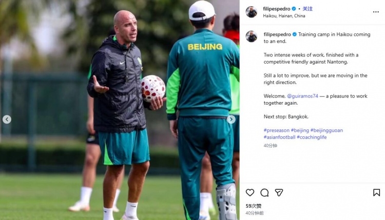 2月1日讯 国安助教菲利佩·佩德罗更新社交媒体,称球队正走在对的路上。菲利佩·佩德罗在个人社交媒体中写道:海口冬训已接近尾声,两周高强度工作,最终在与南通的激烈教学赛中画上句号。虽仍有许多需要改进之处,但我们正走在对的路上。欢迎拉莫斯—很高兴再次与你并肩作战。下一站:曼谷。按照计划,北京国安将于2月3日前往曼谷备战。此前,北京国安官方宣布,28岁葡萄牙后卫吉列尔梅·拉莫斯加盟球队。