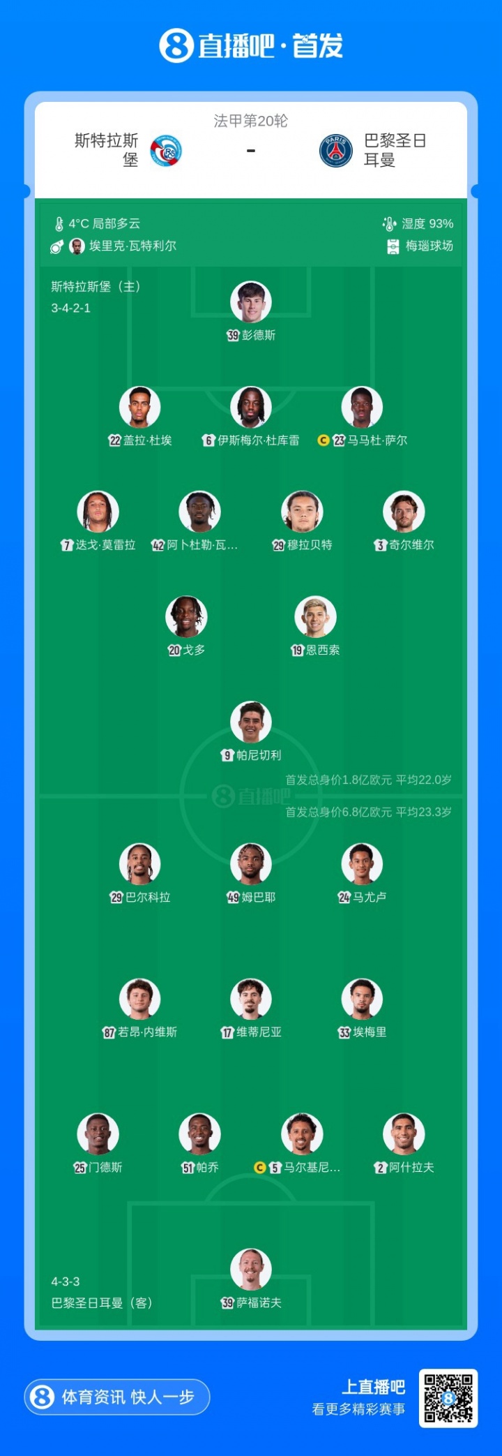 巴黎圣日耳曼首发:39-萨福诺夫、5-马尔基尼奥斯、51-帕乔、2-阿什拉夫、25-门德斯、17-维蒂尼亚、33-埃梅里、87-若昂·内维斯、24-马尤卢、29-巴尔科拉、49-姆巴耶
