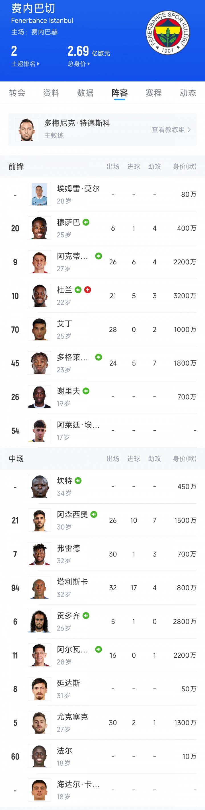 本赛季初,费内巴切解雇穆里尼奥,迎来新帅特德斯科。他们在夏窗也曾疯狂引援,购入阿森西奥、什克里尼亚尔、埃德松、杜兰、阿尔瓦雷斯等诸多五大联赛名将。冬窗再买来贡多齐和坎特等人,他们如今的阵容配置极其豪华。尤其是中场,堪称全明星:坎特、阿森西奥、弗雷德、塔利斯卡、贡多齐、阿尔瓦雷斯……