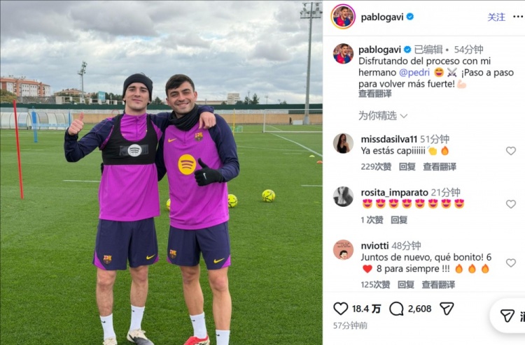 2月4日讯 不久前,巴萨中场加维更新社交媒体,晒出了与佩德里一起进行恢复性训练的合照。
